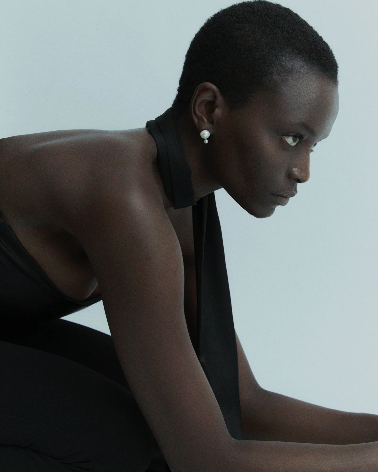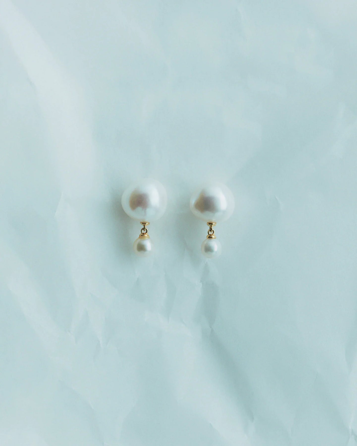 Denne ørering kombinerer en markant ferskvandsperle på øreflippen med en mindre perle lige under – en enkel kontrast, der tilføjer et cool, moderne touch til en tidløs silhuet.