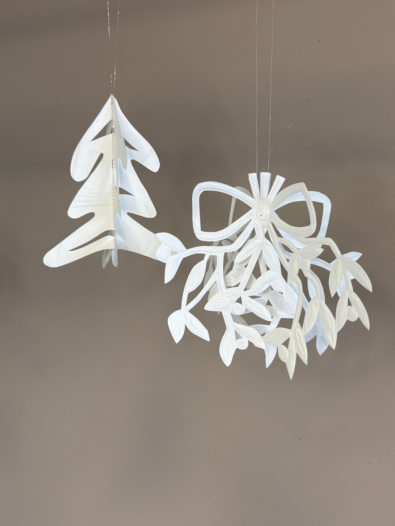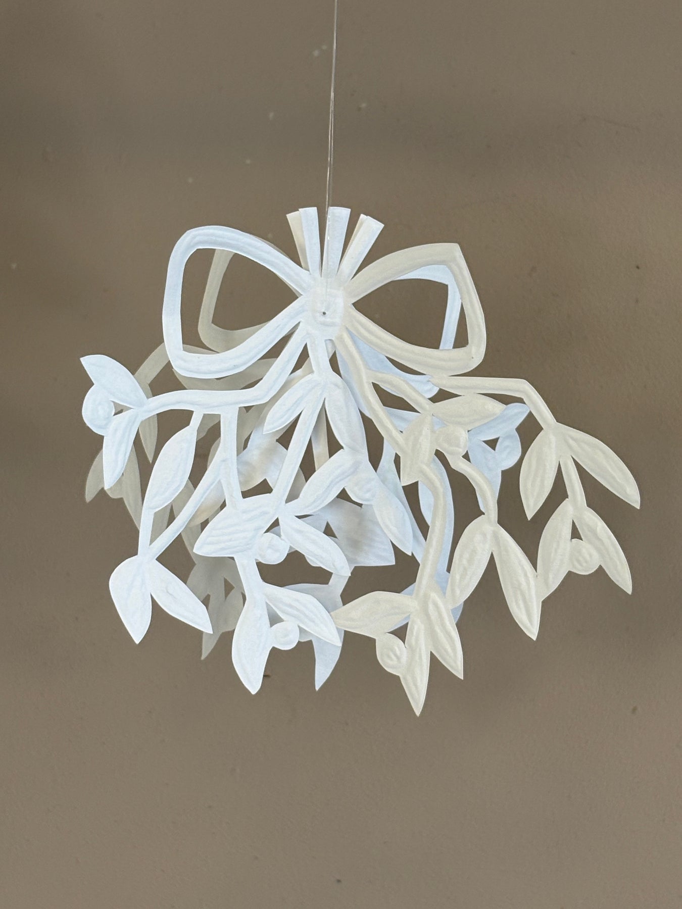 Mistelten i hvid, klippet og skåret i hånden af præget papir. Hænger i guldsnor. Måler ca. 14×18 cm. Vip siderne let fra hinanden, så bliver den mere tredimensionel.