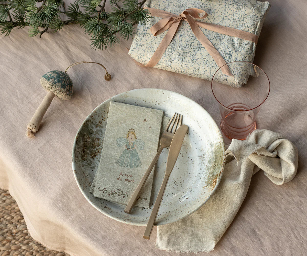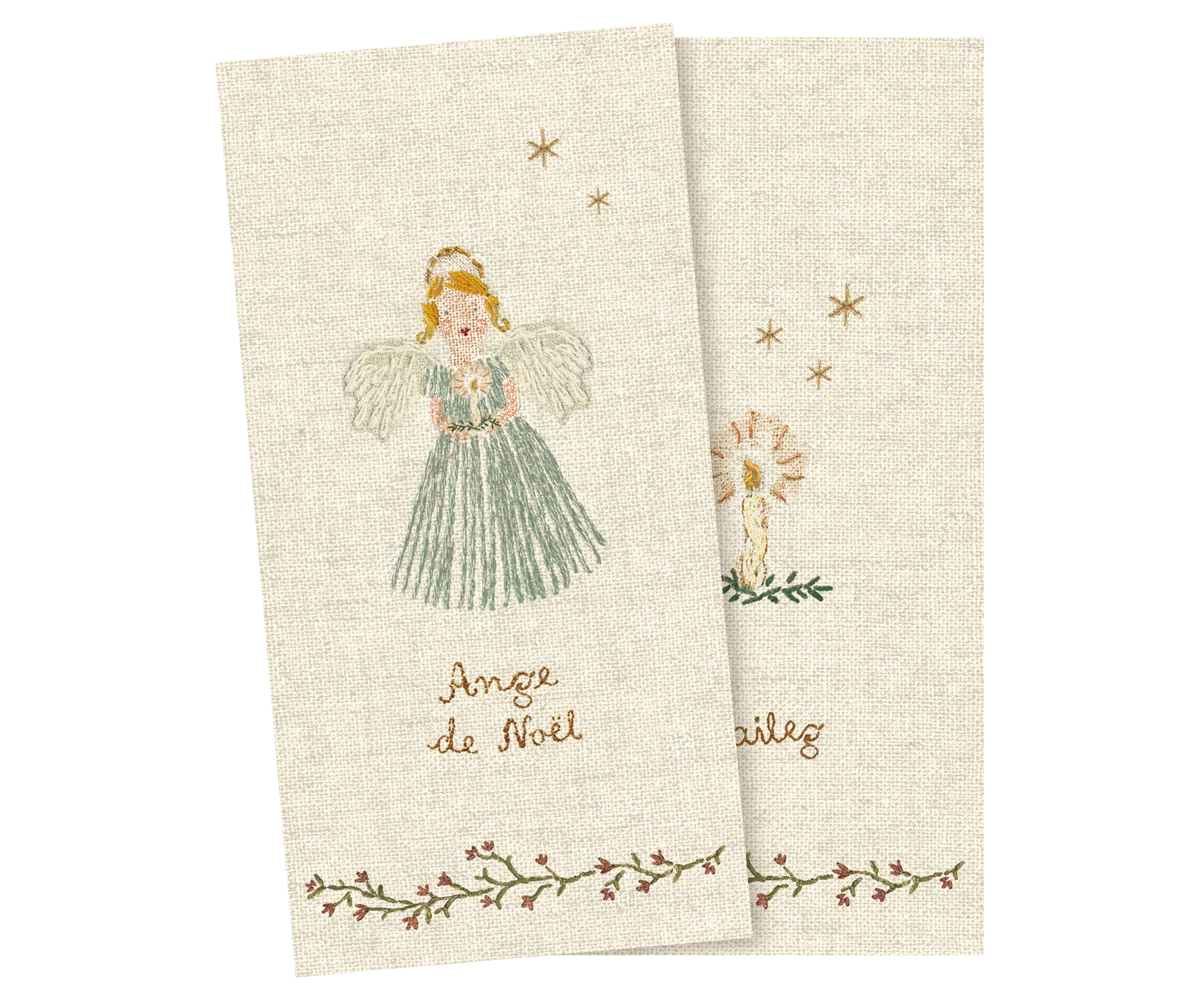 Dekorationen på denne serviet er oprindelig Dorthe Mailils personlige broderier. Efter en grafisk proces har servietterne fået et smukt udtryk med forskellige illustrationer, der fuldender julestemningen.