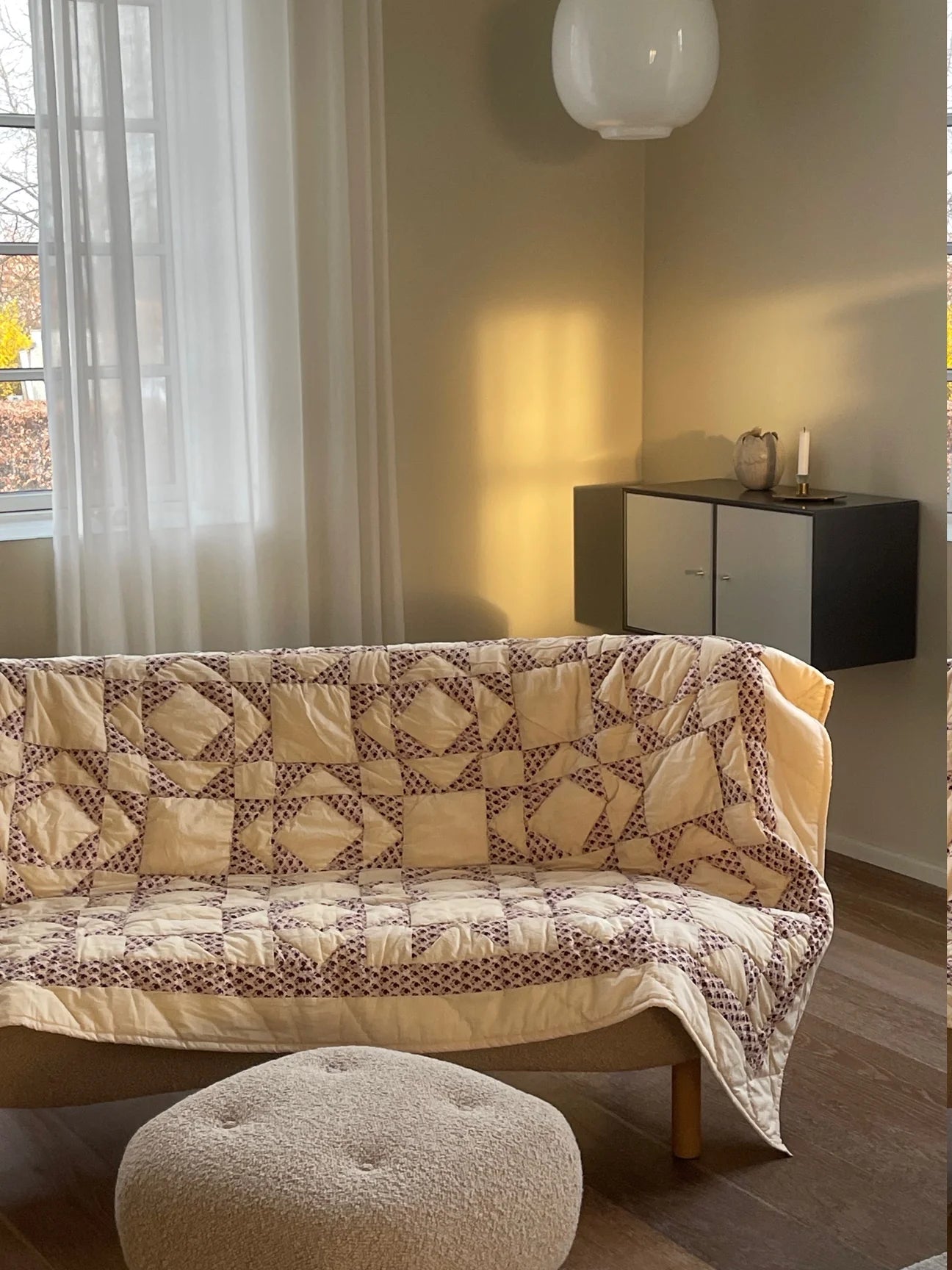Dette smukke patchwork-plaid er designet af Line Meldgaard Hviid og håndsyet af smukke stofrester i Indien.